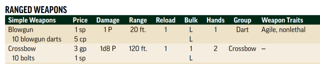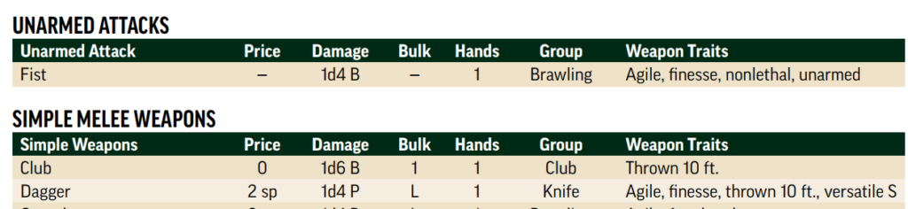 A tabela de armas em Pathfinder 2e (veja abaixo) apresenta informações como preço, dano, volume, mãos necessárias para o uso, grupo ao qual pertence, traços, alcance e recarga. Cada atributo tem sua importância, desde o custo da arma até os efeitos especiais que ela pode ter, como acuidade, que permite usar destreza em vez de força para ataques corpo a corpo, ou fatal e mortal, que alteram o dano crítico de maneira significativa.